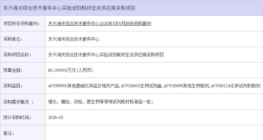东兴海关综合技术服务中心2026年5至6月政府采购意向公开